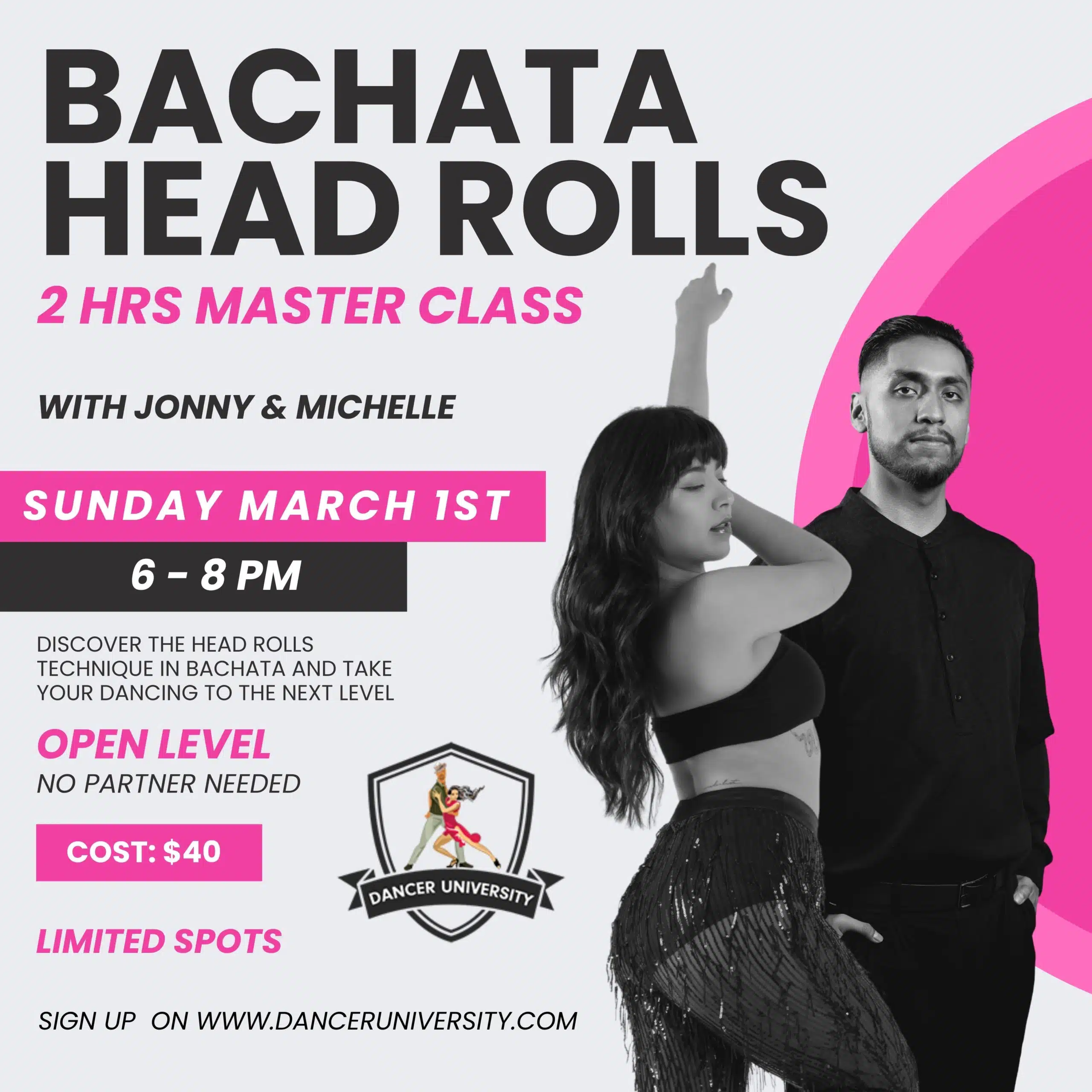 - 6:00 PM – 8:00 PMBachata Head Rolls Masterclass with Jonny & MichelleLocation: Westwood StudioInstructor: Jonny & Michelle